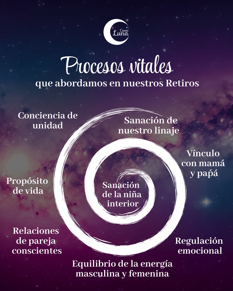 En Casa Luna abordamos procesos vitales en la vida de todo ser humano y entendemos el proceso de sanación como una espiral que empieza poniendo luz sobre nuestras vivencias de la infancia. Estas vivencias deteminan la forma en la que nos vínculamos con nosotrxs mismxs, con los demás, con nuestra pareja y cómo afrontamos la vida.